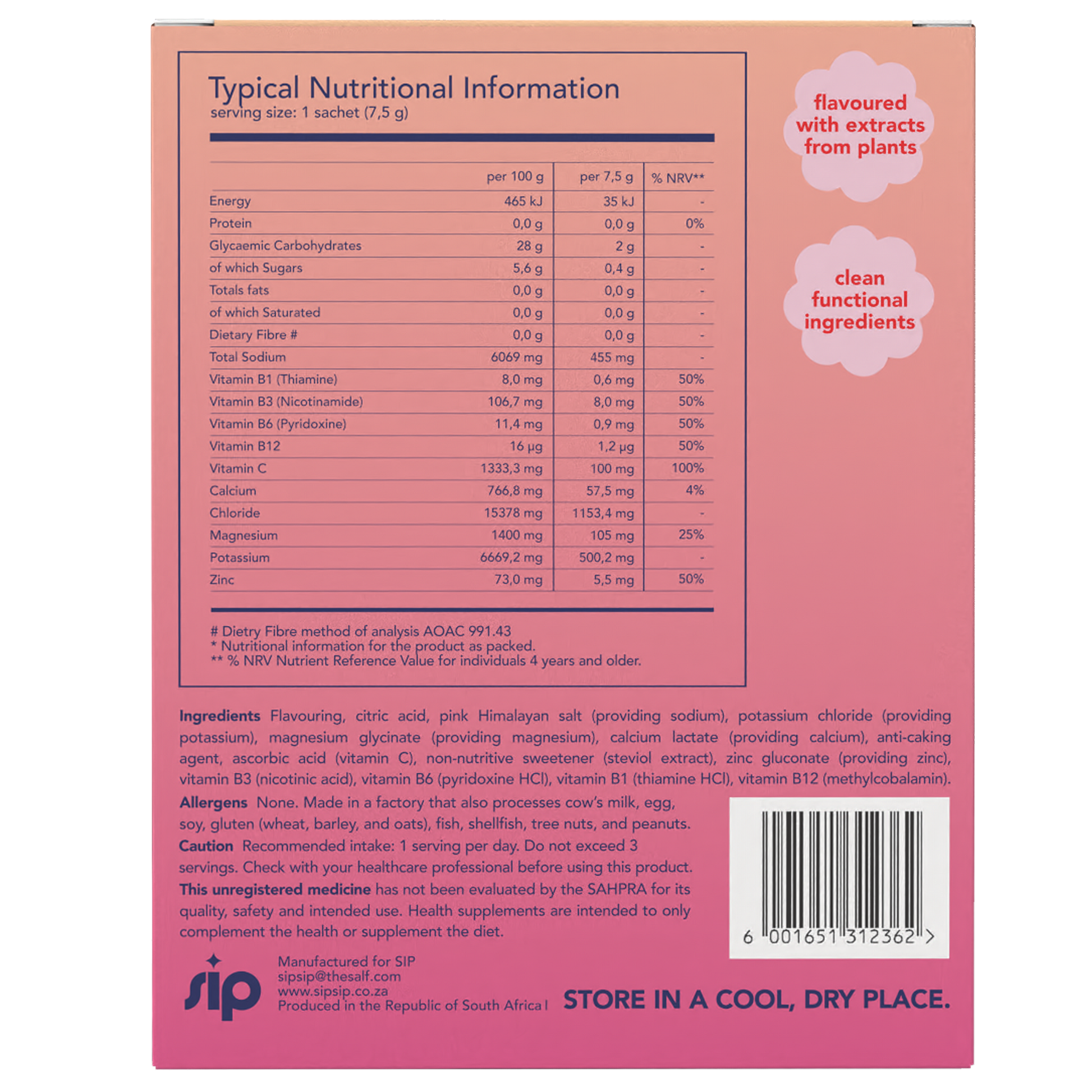 Flavouring, citric acid, pink Himalayan salt (providing sodium), potassium chloride (providing potassium), magnesium glycinate (providing magnesium, calcium lactate (providing calcium), anti-caking agent, ascorbic acid (vitamin C), non-nutritive sweetener (steviol extract), zinc gluconate (providing zinc), vitamin B3 (nicotinic acid), vitamin B6 (pyridoxine HCI), vitamin B1 (thiamine HCI), vitamin B12 (methylcobalamin).