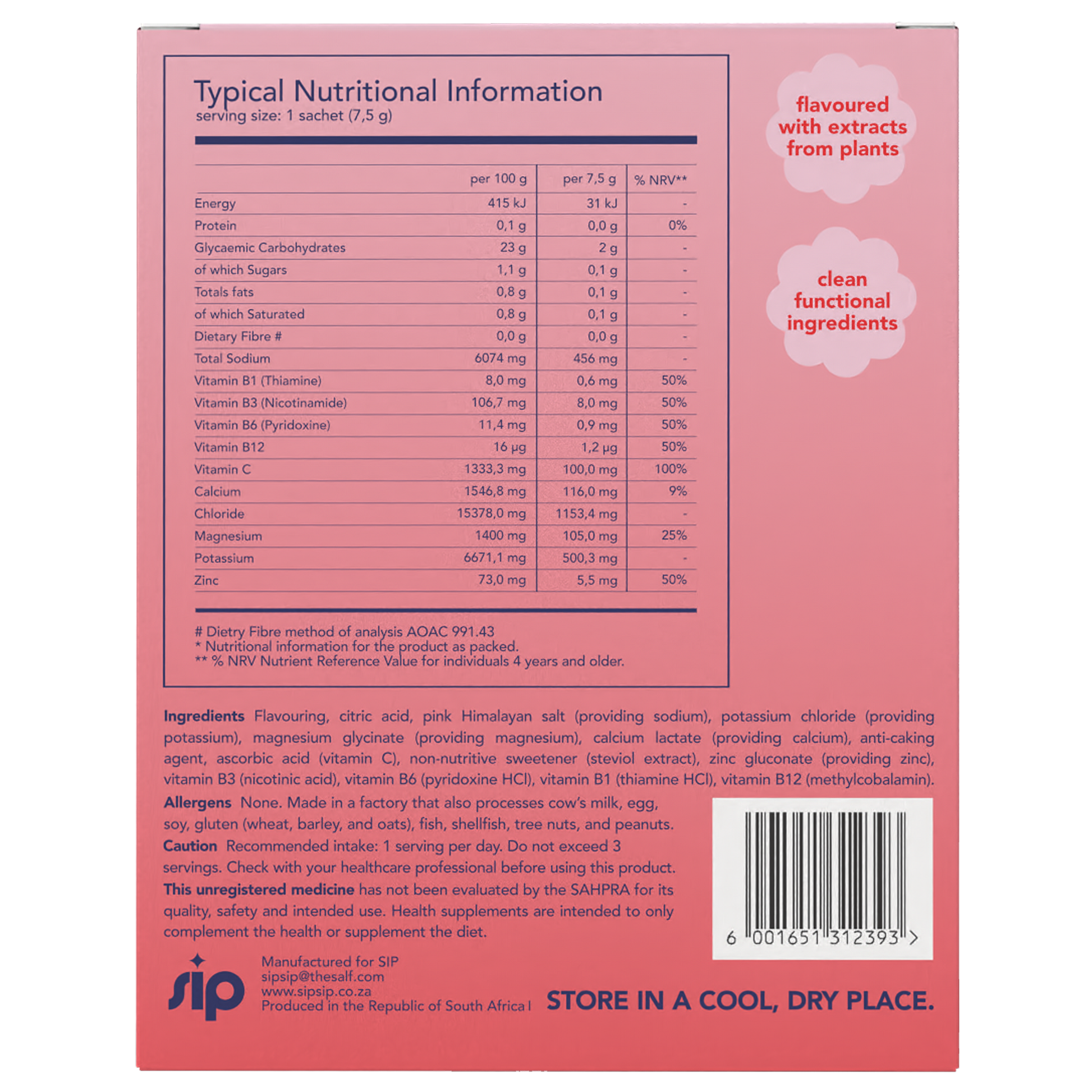 Flavouring, citric acid, pink Himalayan salt (providing sodium), potassium chloride (providing potassium), calcium lactate (providing calcium), magnesium glycinate (providing magnesium), anti-caking agent, ascorbic acid (vitamin C), non-nutritive sweetener (steviol extract), zinc gluconate (providing zinc), vitamin B3 (nicotinic acid), vitamin B6 (pyridoxine HCI), vitamin B1 (thiamine HCI), vitamin B12 (methylcobalamin).