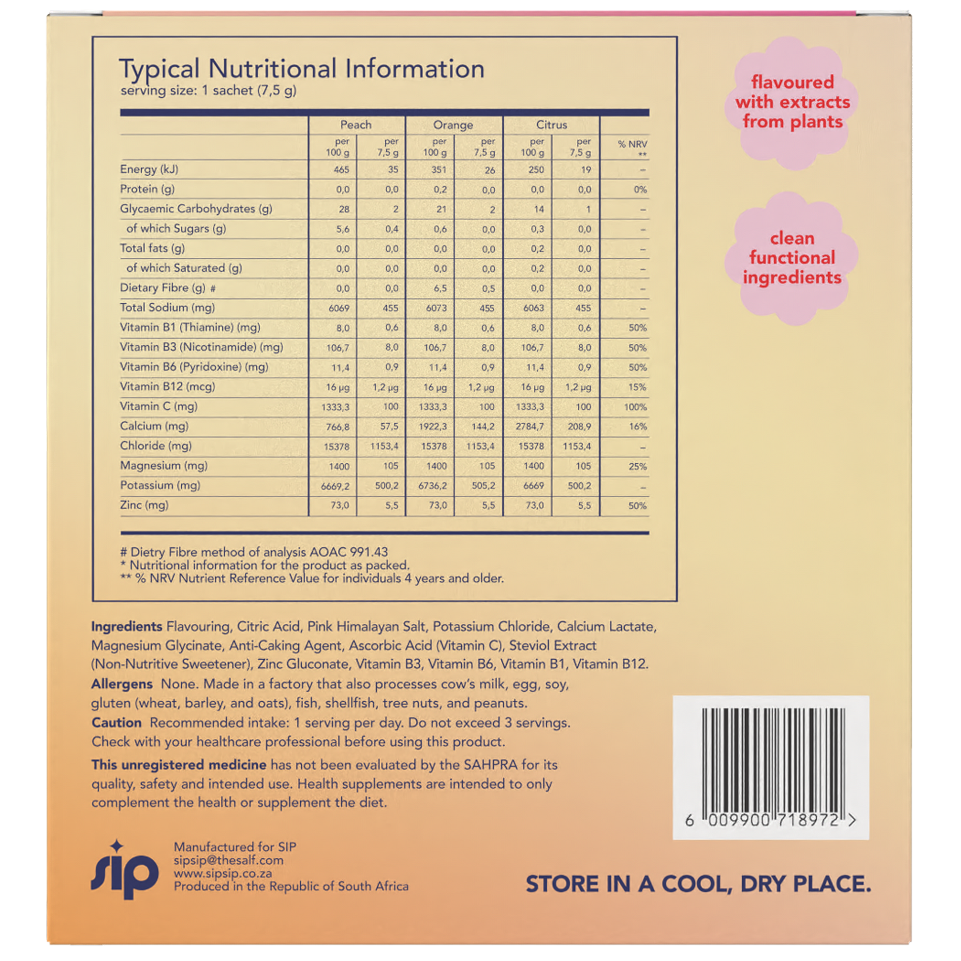 Calcium lactate (providing calcium, citric acid, flavouring, pink Himalayan salt (providing sodium), potassium chloride (providing potassium), magnesium glycinate (providing magnesium), anti-caking agent, ascorbic acid (vitamin C), non-nutritive sweetener (steviol extract), zinc gluconate (providing zinc), vitamin B3 (nicotinic acid), vitamin B6 (pyridoxine HCI), vitamin B1 (thiamine HCI), vitamin B12 (methylcobalamin).